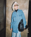 Our Denim Heart Jacket is 90% cotton and 10% polyester with vintage-inspired brushed silver hardware, dropped shoulder and two front chest pockets. She is truly an oversized fit with a wide and long body.