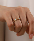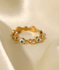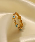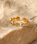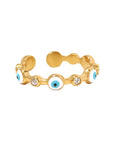 Protect your vibe in style with the Aura Shield ring featuring iconic evil eye charms and sparkling crystals on a sleek gold-tone band. Waterproof, adjustable, and full of good energy, this piece is your everyday guardian with a glam twist.
