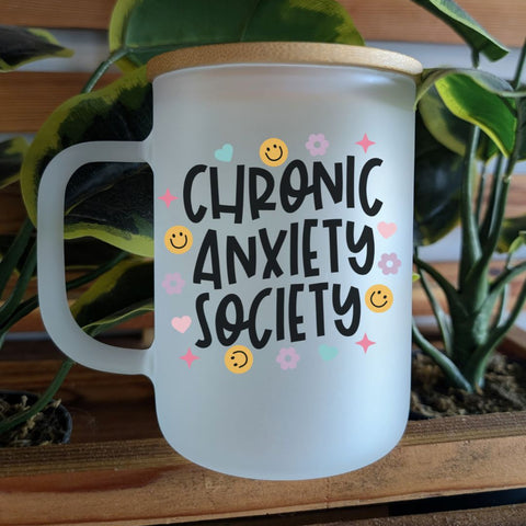 Join the club with this Chronic Anxiety Society Glass Mug. The perfect addition to your morning routine, this mug will make you feel seen and understood (and maybe even a little less anxious). Embrace your quirks and enjoy your coffee with a wink and a sip.