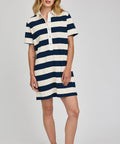 The Colbie dress is made of a cotton jersey with a classic rugby stripe. Features include a contrast collar, half placket button closure, and side slits.