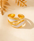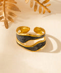 Flowing with effortless grace, the Satin Wave ring features soft, ivory and lustrous black enamel swirls set in a lustrous gold-tone band. Inspired by ocean tides and silky textures, it's waterproof, tarnish-resistant, and perfect for effortless everyday elegance — rain or shine.