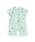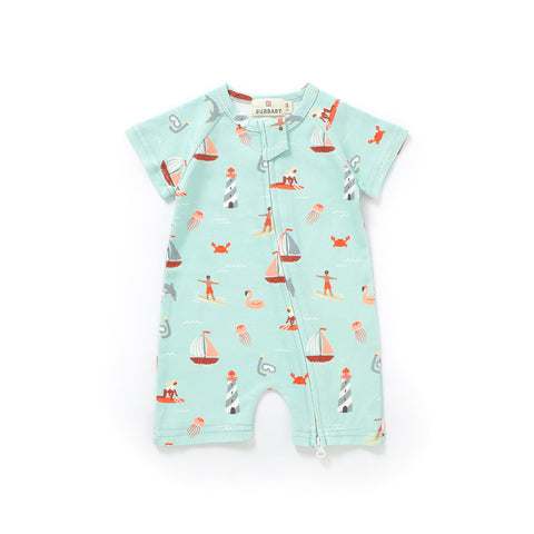 Make waves this summer with our Seas the Day short sleeve romper! Designed for little explorers who are ready to dive into fun, this coastal-inspired print features sailboats, jellyfish, lighthouses, snorkels, surfers, and even playful crabs. Whether you’re off to the beach or lounging at home, this romper keeps your baby comfy, cool, and cute all day long.