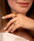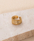 Bold, structured, and timeless, The Empire Ring commands attention with its layered ridges and intricate beaded edges. Crafted in a rich gold-tone finish, this waterproof and adjustable piece is a modern classic built for power moves and polished style.