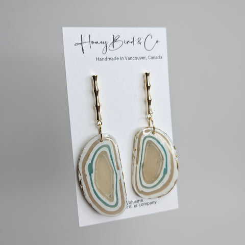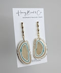 Add a touch of earthy elegance to your jewelry collection with these stunning Geode-Inspired Resin Drop Earrings from Honey Bird & Co. Hues of beige, cream, white, and teal create a soothing palette that’s both organic and refined.
